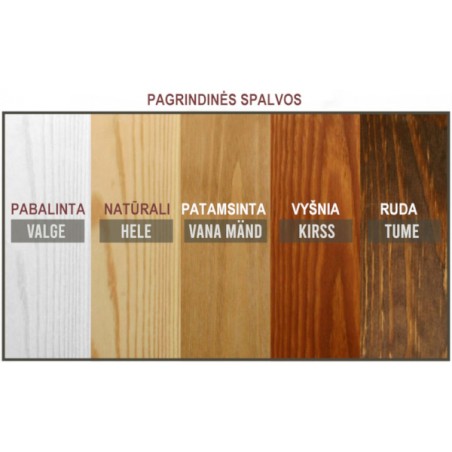 Pagrindinių 5 spalvų pasirinkimas kai kaina nesikeičia: pabalinta (valge), natūrali pušies spalva (hele), vos patamsinta (vana mand), vyšnios (kirss), tamsiai ruda (tume).